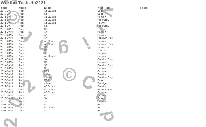 Below is an abbreviated list of applications for the FloorLiner DigitalFit.A4, A5, A5 Quattro, allroad, RS5, S4, S5, Audi, 2017, 2016, 2015, 2014, 2013, 2012, 2011, 2010, 2009, 2008