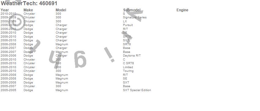 Below is an abbreviated list of applications for the FloorLiner DigitalFit.300, Charger, Magnum, Chrysler, Dodge, 2010, 2009, 2008, 2007, 2006, 2005