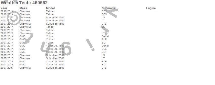Below is an abbreviated list of applications for the FloorLiner DigitalFit.Suburban 1500, Suburban 2500, Tahoe, Yukon, Yukon XL 1500, Yukon XL 2500, Chevrolet, GMC, 2014, 2013, 2012, 2011, 2010, 2009, 2008, 2007