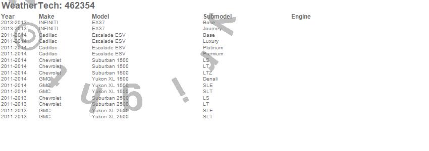 Below is an abbreviated list of applications for the FloorLiner DigitalFit.Escalade ESV, EX37, Suburban 1500, Suburban 2500, Yukon XL 1500, Yukon XL 2500, Cadillac, Chevrolet, GMC, INFINITI, 2014, 2013, 2012, 2011