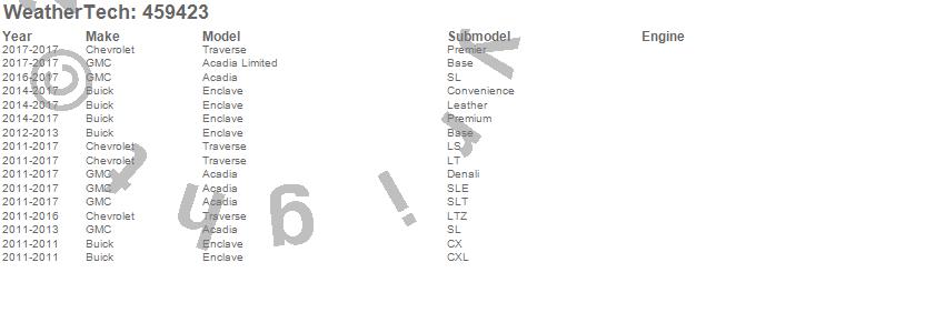 Below is an abbreviated list of applications for the FloorLiner DigitalFit.Acadia, Acadia Limited, Enclave, Traverse, Buick, Chevrolet, GMC, 2017, 2016, 2015, 2014, 2013, 2012, 2011