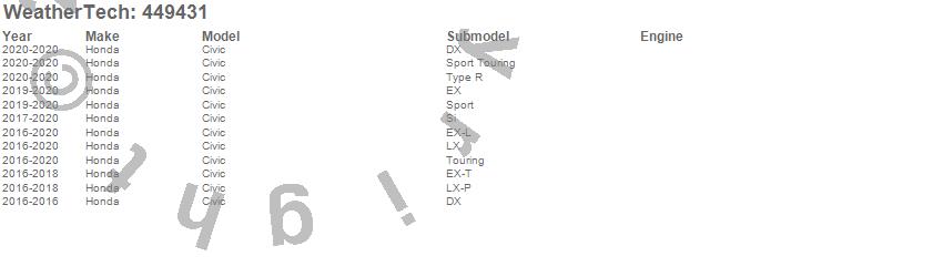 Below is an abbreviated list of applications for the FloorLiner DigitalFit.Civic, Honda, 2020, 2019, 2018, 2017, 2016