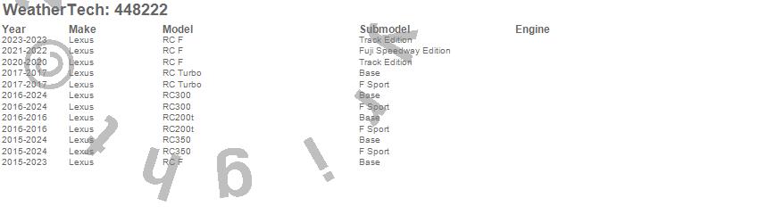 Below is an abbreviated list of applications for the FloorLiner DigitalFit.RC F, RC Turbo, RC200t, RC300, RC350, Lexus, 2024, 2023, 2022, 2021, 2020, 2019, 2018, 2017, 2016, 2015