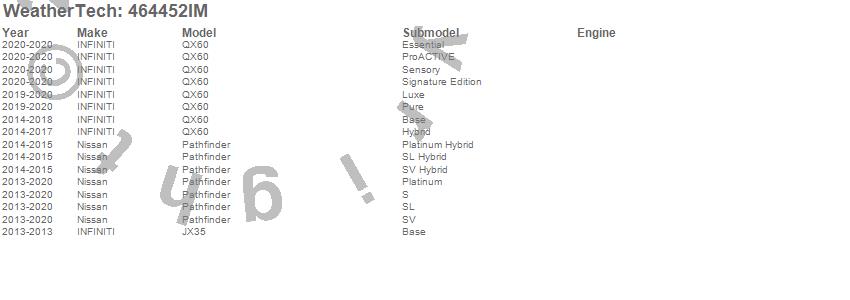 Below is an abbreviated list of applications for the FloorLiner HP.JX35, Pathfinder, QX60, INFINITI, Nissan, 2020, 2019, 2018, 2017, 2016, 2015, 2014, 2013