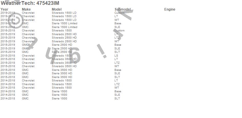 Below is an abbreviated list of applications for the FloorLiner HP.Sierra 1500, Sierra 1500 Limited, Sierra 2500 HD, Sierra 3500 HD, Silverado 1500, Silverado 1500 LD, Silverado 2500 HD, Silverado 3500 HD, Chevrolet, GMC, 2019, 2018, 2017, 2016, 2015, 2014