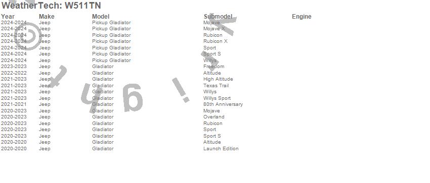 Below is an abbreviated list of applications for the All Weather Floor Mats.Gladiator, Pickup Gladiator, Jeep, 2026, 2025, 2024, 2023, 2022, 2021, 2020