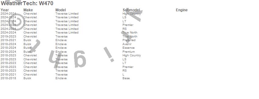 Below is an abbreviated list of applications for the All Weather Floor Mats.Enclave, Traverse, Traverse Limited, Buick, Chevrolet, 2024, 2023, 2022, 2021, 2020, 2019, 2018