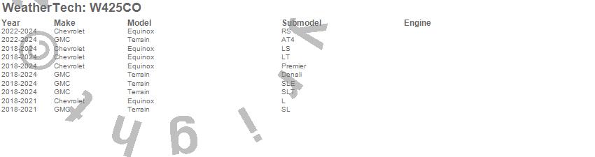Below is an abbreviated list of applications for the All Weather Floor Mats.Equinox, Terrain, Chevrolet, GMC, 2026, 2025, 2024, 2023, 2022, 2021, 2020, 2019, 2018