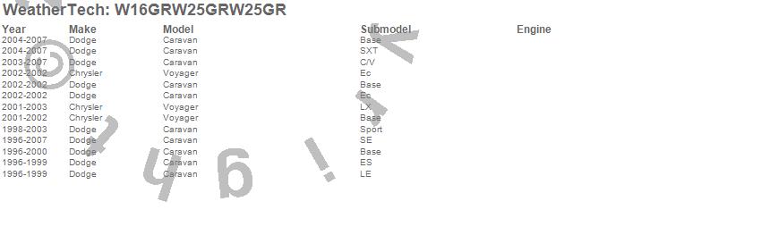 Below is an abbreviated list of applications for the All Weather Floor Mats.Caravan, Voyager, Chrysler, Dodge, 2007, 2006, 2005, 2004, 2003, 2002, 2001, 2000, 1999, 1998, 1997, 1996