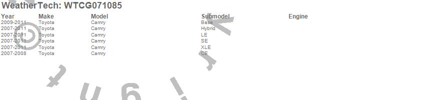 Below is an abbreviated list of applications for the All Weather Floor Mats.Camry, Toyota, 2011, 2010, 2009, 2008, 2007