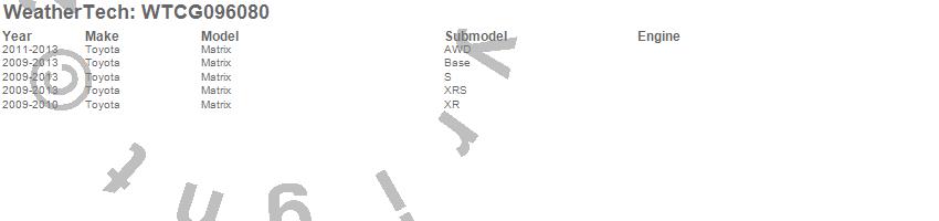 Below is an abbreviated list of applications for the All Weather Floor Mats.Matrix, Toyota, 2013, 2012, 2011, 2010, 2009
