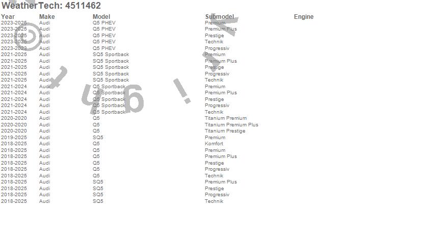 Below is an abbreviated list of applications for the FloorLiner DigitalFit.Q5, Q5 PHEV, Q5 Sportback, SQ5, SQ5 Sportback, Audi, 2025, 2024, 2023, 2022, 2021, 2020, 2019, 2018