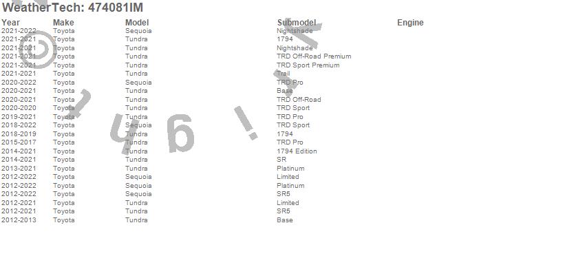 Below is an abbreviated list of applications for the FloorLiner HP.Sequoia, Tundra, Toyota, 2022, 2021, 2020, 2019, 2018, 2017, 2016, 2015, 2014, 2013, 2012