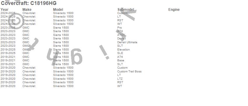 Below is an abbreviated list of applications for the Custom Fit Cab Cover.Sierra 1500, Silverado 1500, Chevrolet, GMC, 2025, 2024, 2023, 2022, 2021, 2020, 2019