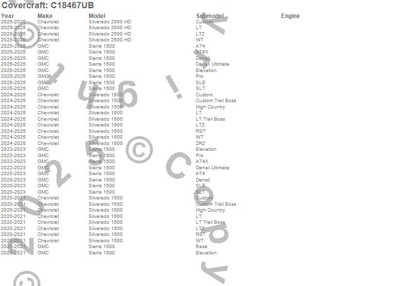 Below is an abbreviated list of applications for the Custom Fit Cab Cover.Sierra 1500, Silverado 1500, Silverado 2500 HD, Chevrolet, GMC, 2025, 2024, 2023, 2022, 2021, 2020