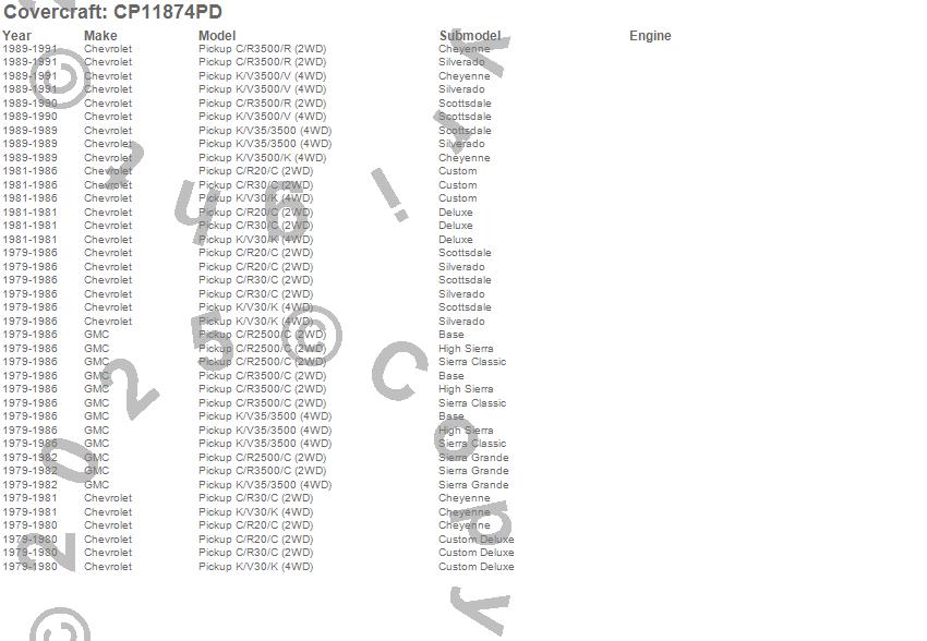 Below is an abbreviated list of applications for the Custom Cab Cooler.C20 Pickup, C2500 Pickup, C30 Pickup, C35/C3500 Pickup, C3500 Pickup, K30 Pickup, K3500 Pickup, R3500 Pickup, V3500 Pickup, Chevrolet, GMC, 1991, 1990, 1989, 1986, 1985, 1984, 1983, 1982, 1981