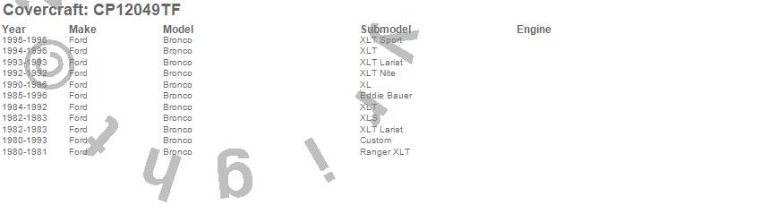 Below is an abbreviated list of applications for the Custom Cab Cooler.Bronco, Ford, 1996, 1995, 1994, 1993, 1992, 1991, 1990, 1989, 1988, 1987, 1986, 1985, 1984, 1983, 1982, 1981, 1980