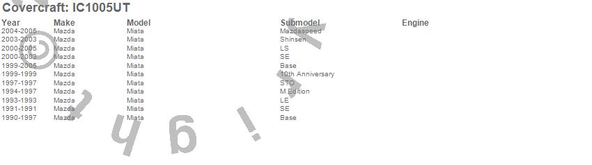 Below is an abbreviated list of applications for the Custom Convertible Interior Cover.Miata, Mazda, 2005, 2004, 2003, 2002, 2001, 2000, 1999, 1997, 1996, 1995, 1994, 1993, 1992, 1991, 1990