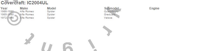 Below is an abbreviated list of applications for the Custom Convertible Interior Cover.Spider, Alfa Romeo, 1990, 1989, 1988, 1987, 1986, 1985, 1984, 1983, 1982, 1981, 1980, 1979, 1978, 1977, 1976, 1975, 1974, 1973