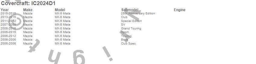 Below is an abbreviated list of applications for the Custom Convertible Interior Cover.MX-5 Miata, Mazda, 2015, 2014, 2013, 2012, 2011, 2010, 2009, 2008, 2007, 2006