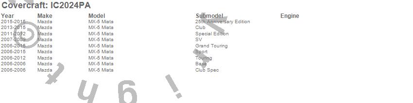 Below is an abbreviated list of applications for the Custom Convertible Interior Cover.MX-5 Miata, Mazda, 2015, 2014, 2013, 2012, 2011, 2010, 2009, 2008, 2007, 2006