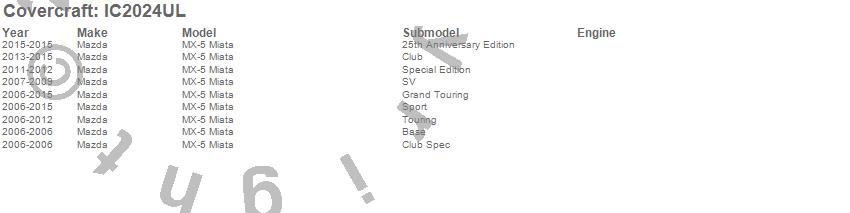 Below is an abbreviated list of applications for the Custom Convertible Interior Cover.MX-5 Miata, Mazda, 2015, 2014, 2013, 2012, 2011, 2010, 2009, 2008, 2007, 2006