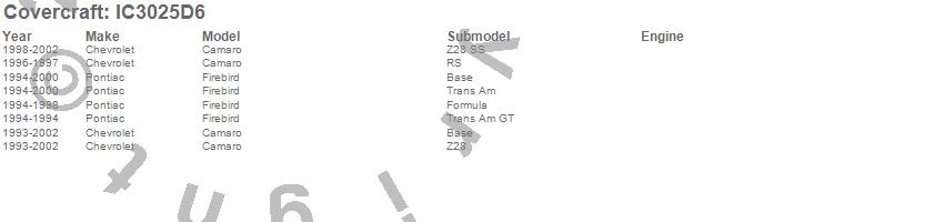Below is an abbreviated list of applications for the Custom Convertible Interior Cover.Camaro, Firebird, Chevrolet, Pontiac, 2002, 2001, 2000, 1999, 1998, 1997, 1996, 1995, 1994, 1993