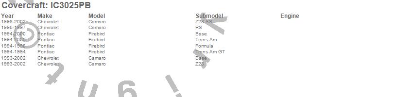 Below is an abbreviated list of applications for the Custom Convertible Interior Cover.Camaro, Firebird, Chevrolet, Pontiac, 2002, 2001, 2000, 1999, 1998, 1997, 1996, 1995, 1994, 1993