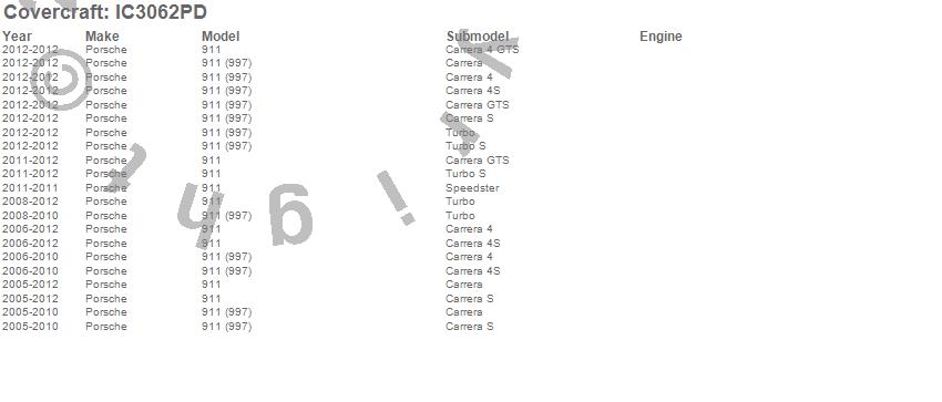 Below is an abbreviated list of applications for the Custom Convertible Interior Cover.911, Porsche, 2012, 2011, 2010, 2009, 2008, 2007, 2006, 2005