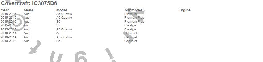 Below is an abbreviated list of applications for the Custom Convertible Interior Cover.A5, A5 Quattro, S5, Audi, 2016, 2015, 2014, 2013, 2012, 2011, 2010