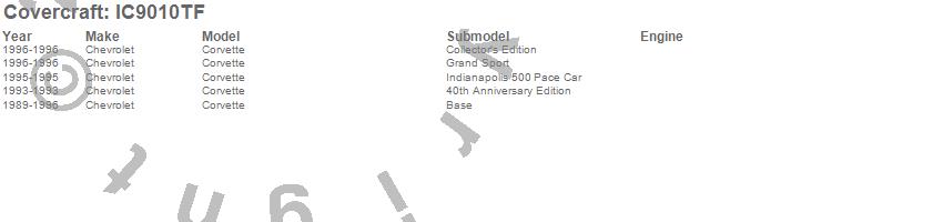 Below is an abbreviated list of applications for the Custom Hardtop Cover.Corvette, Chevrolet, 1996, 1995, 1994, 1993, 1992, 1991, 1990, 1989