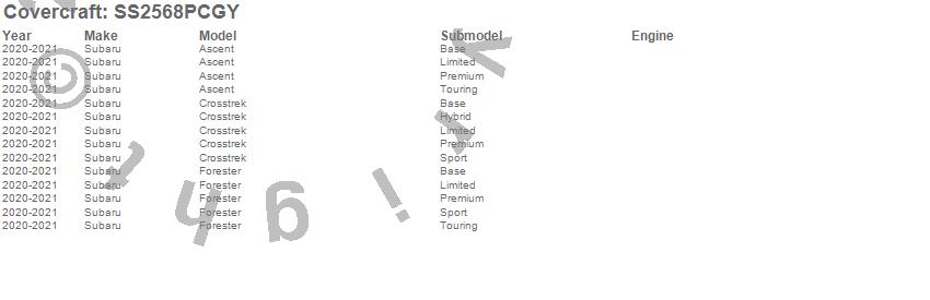 Below is an abbreviated list of applications for the SeatSaver Custom Seat Cover.Ascent, Crosstrek, Forester, Subaru, 2025, 2024, 2021, 2020