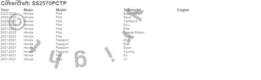 Below is an abbreviated list of applications for the SeatSaver Custom Seat Cover.Passport, Pilot, Honda, 2022, 2021