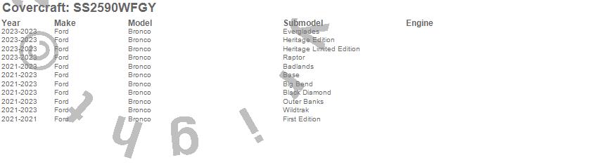 Below is an abbreviated list of applications for the SeatSaver Custom Seat Cover.Bronco, Ford, 2025, 2024, 2023, 2022, 2021