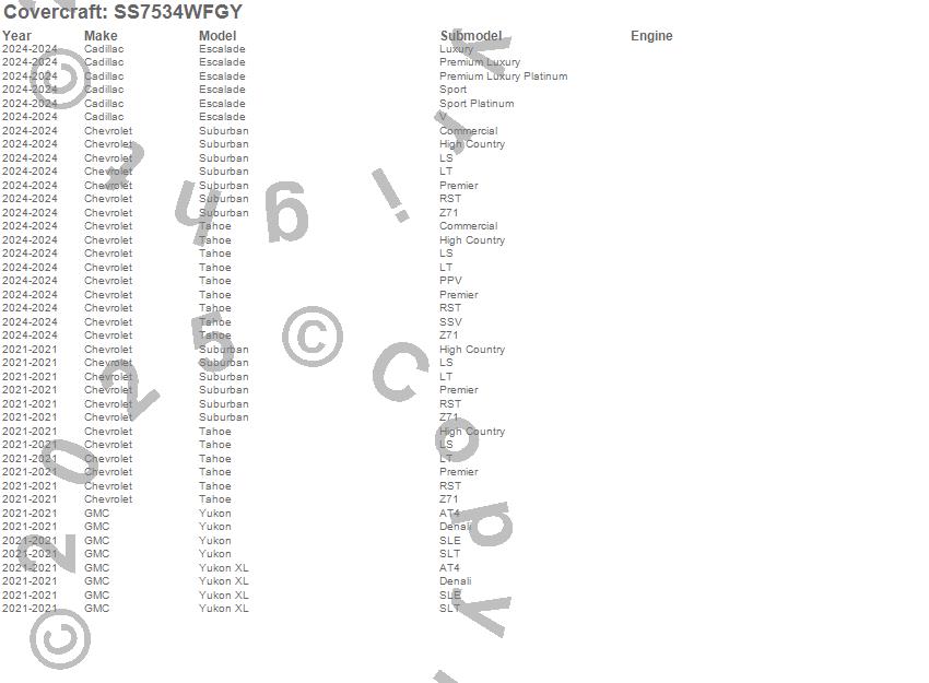 Below is an abbreviated list of applications for the SeatSaver Custom Seat Cover.Escalade, Escalade ESV, Suburban, Tahoe, Yukon, Yukon XL, Cadillac, Chevrolet, GMC, 2026, 2025, 2024, 2021
