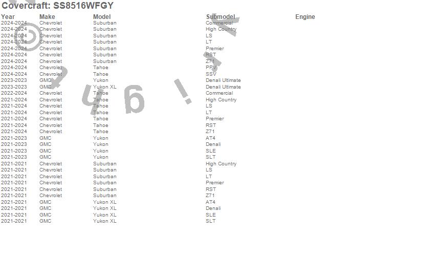 Below is an abbreviated list of applications for the SeatSaver Custom Seat Cover.Suburban, Tahoe, Yukon, Yukon XL, Chevrolet, GMC, 2026, 2025, 2024, 2023, 2022, 2021