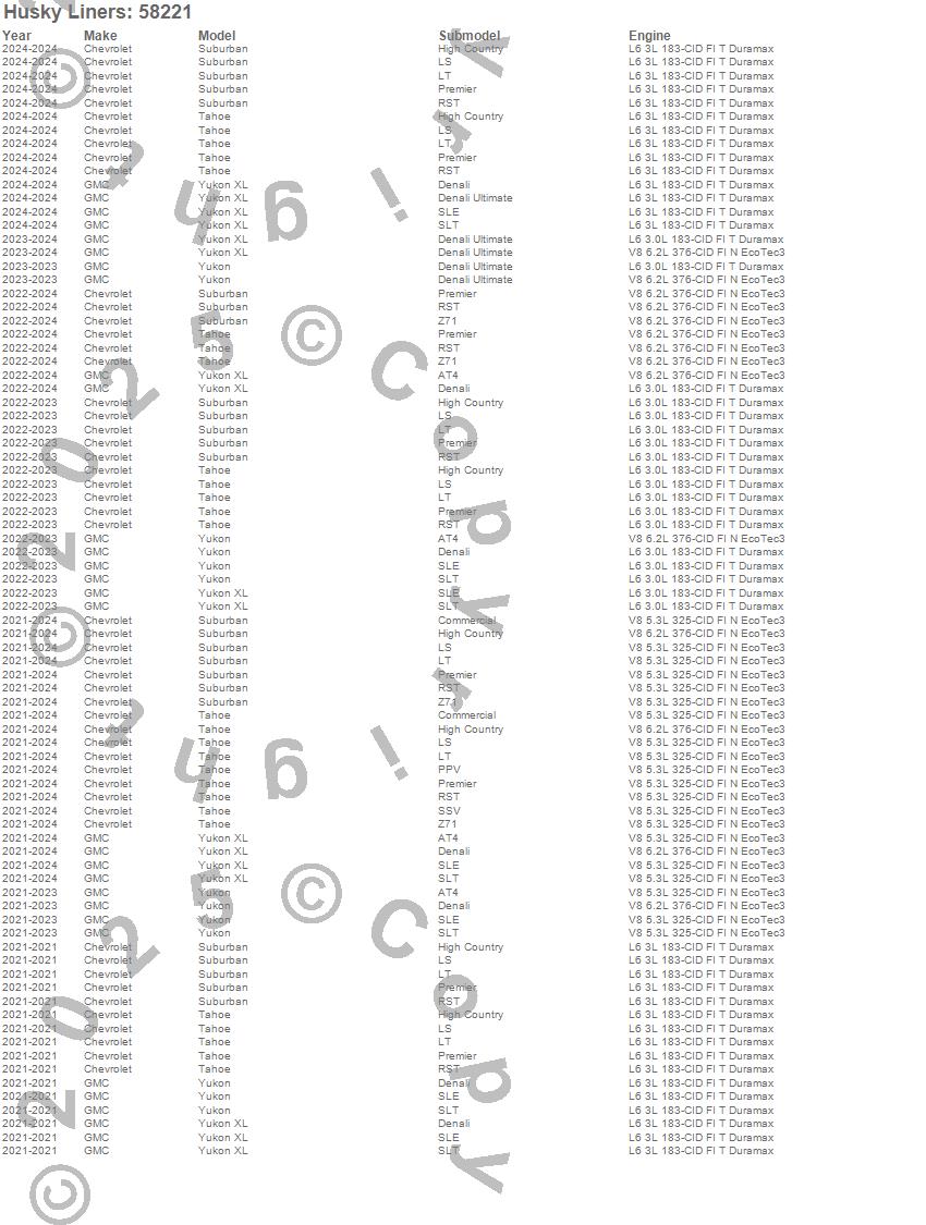 Below is an abbreviated list of applications for the Custom Molded Mud Guards.Suburban, Tahoe, Yukon, Yukon XL, Chevrolet, GMC, 2026, 2025, 2024, 2023, 2022, 2021