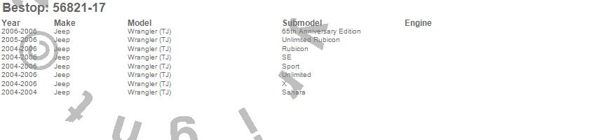Below is an abbreviated list of applications for the Trektop Slantback Soft Top.Wrangler (TJ), Jeep, 2006, 2005, 2004