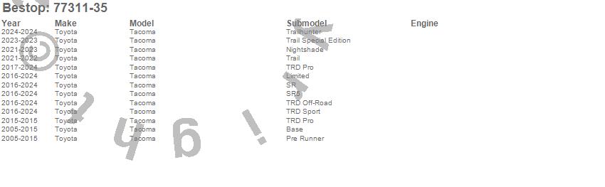 Below is an abbreviated list of applications for the Supertop For Truck 2.Tacoma, Toyota, 2024, 2023, 2022, 2021, 2020, 2019, 2018, 2017, 2016, 2015, 2014, 2013, 2012, 2011, 2010, 2009, 2008, 2007
