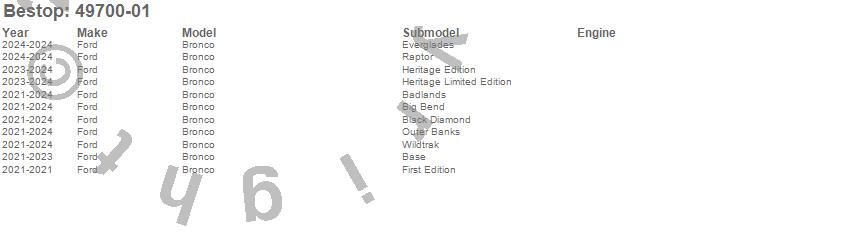 Below is an abbreviated list of applications for the Bestop Fender Flares.Bronco, Ford, 2026, 2025, 2024, 2023, 2022, 2021