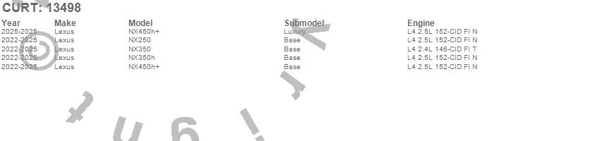 Below is an abbreviated list of applications for the Class III 2 in. Receiver Hitch.NX250, NX350, NX350h, NX450h+, Lexus, 2025, 2024, 2023, 2022