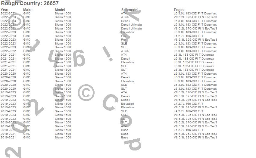 Below is an abbreviated list of applications for the Suspension Lift Kit w/Shocks.Sierra 1500, GMC, 2023, 2022, 2021, 2020, 2019