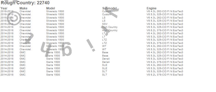 Below is an abbreviated list of applications for the Suspension Lift Kit w/Shocks.Sierra 1500, Silverado 1500, Chevrolet, GMC, 2018, 2017, 2016, 2015, 2014
