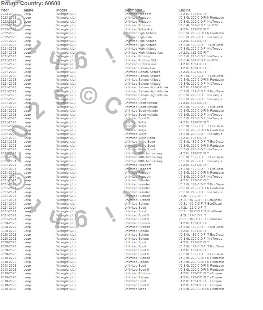 Below is an abbreviated list of applications for the Suspension Lift Kit.Wrangler (JL), Jeep, 2023, 2022, 2021, 2020, 2019, 2018
