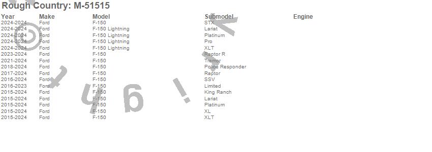 Brand: Rough CountryPart Number: M-51515Floor Mat Set Type: Front And Rear - Bucket SeatsUPC: 840269922657