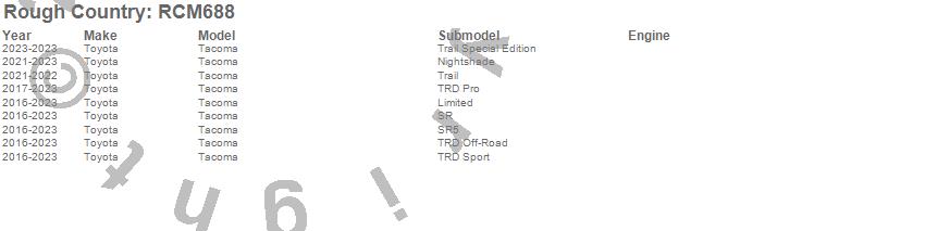 Brand: Rough CountryPart Number: RCM688Truck Bed Mat Type: w/RC LogoUPC: 840269921209