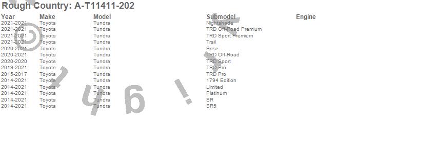 Below is an abbreviated list of applications for the Pocket Fender Flares.Tundra, Toyota, 2021, 2020, 2019, 2018, 2017, 2016, 2015, 2014