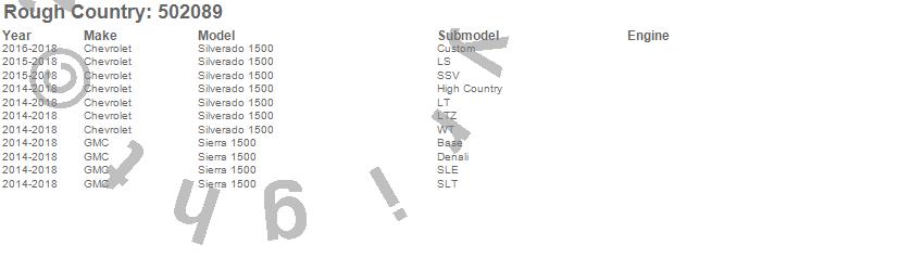 Brand: Rough CountryPart Number: 502089Suspension Strut Assembly Type: 6 in. Lift - Front - Adjustable Leveling - 23.85 in. Extended Length - 20.31 in. Collapsed Length - PairUPC: 840269916854