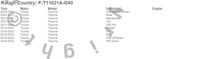 Below is an abbreviated list of applications for the Pocket Fender Flares.Tacoma, Toyota, 2023, 2022, 2021, 2020, 2019, 2018, 2017, 2016