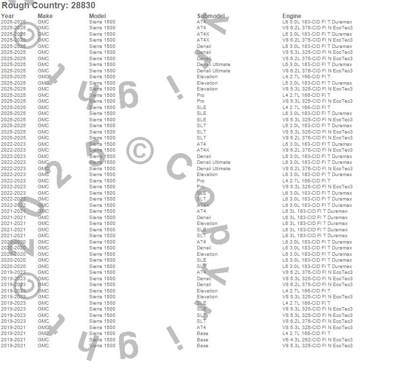Below is an abbreviated list of applications for the Suspension Lift Kit w/Shocks.Sierra 1500, GMC, 2025, 2023, 2022, 2021, 2020, 2019